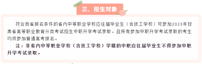 以上就是“2023年甘肃交通职业技术学院“中职升学考试录取”报考指南”的全部内容,更多关于甘肃高职分类考试的相关内容,如甘肃高职分类考试报考条件、报名时间、考试科目、甘肃高职分类考试成绩查询、分数线等敬请关注甘肃高职分类考试网。