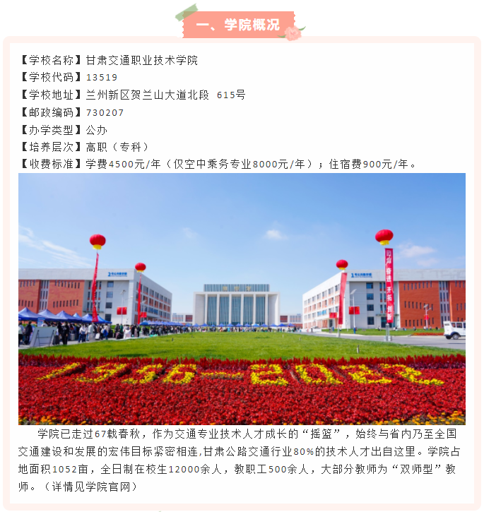 您现在的位置: 甘肃传爱高职高招网 >  招生院校 > 甘肃交通职业技术学院 > 招生简章  > 2023年甘肃交通职业技术学院“中职升学考试录取”报考指南